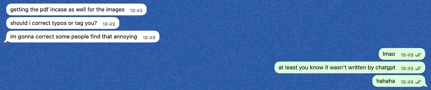 Typos are the new artisanal imperfection that prove you’re present in the moment. Send me a topline email with an obvious slip-up that features a sound idea, and I will trust that sender more than someone who drops a technically perfect five-paragraph GPT response that reads like a LinkedIn thought-leader just threw up on my inbox.
